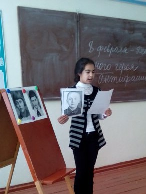 8 февраля – день юного героя-антифашиста. Классный руководитель 5 класса Гараева Р.Р.провела классный час ко Дню юного героя-антифашиста, целью познакомить детей с юными героями-антифашистами, пионерами-героями Великой Отечественной войны, воспитывать чувства долга, патриотизма и любви к своей Родине, чувства уважения к памяти героев, сострадание к людям, гражданской ответственности и гуманистического мировоззрения, развивать кругозор.
