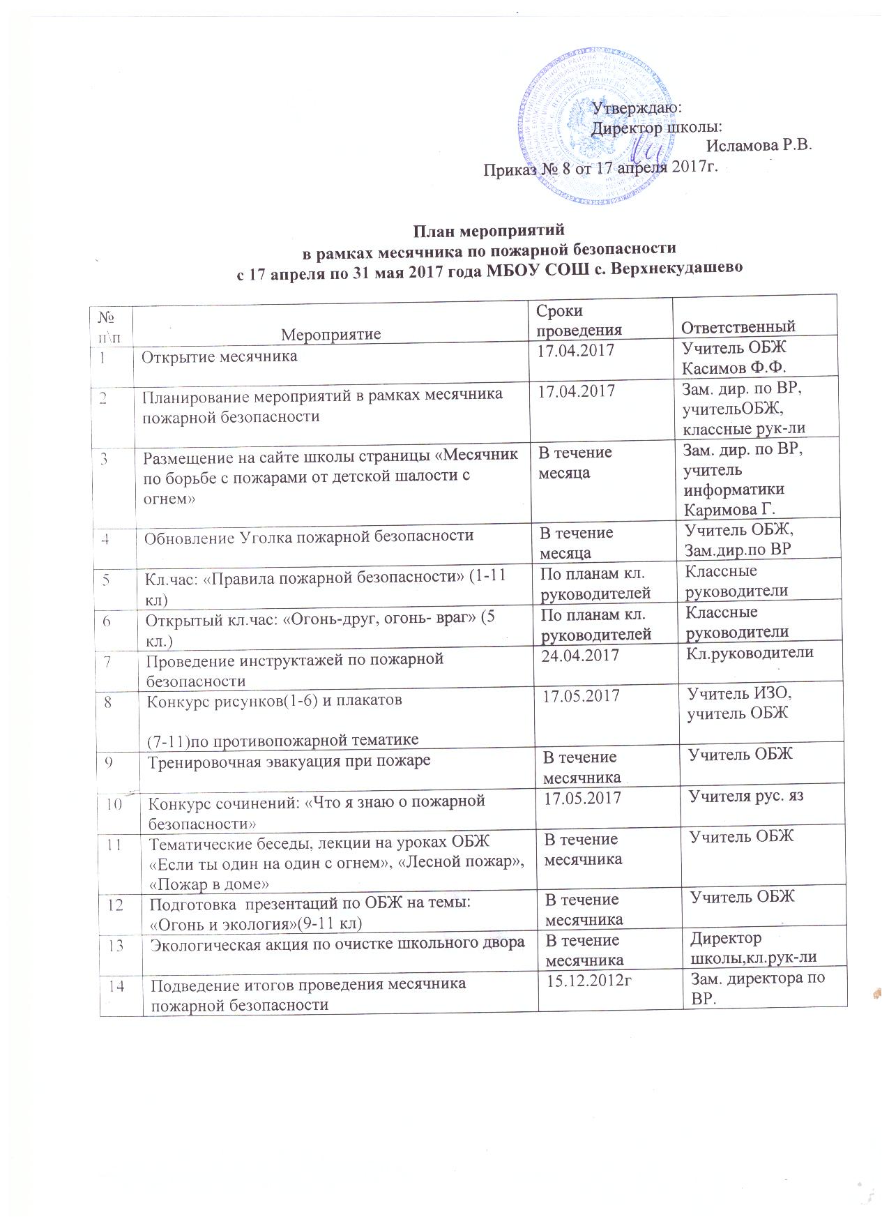 План мероприятий в рамках месячника по пожарной безопасности с 17 апреля по 31 мая 2017 года МБОУ СОШ с.Верхнекудашево